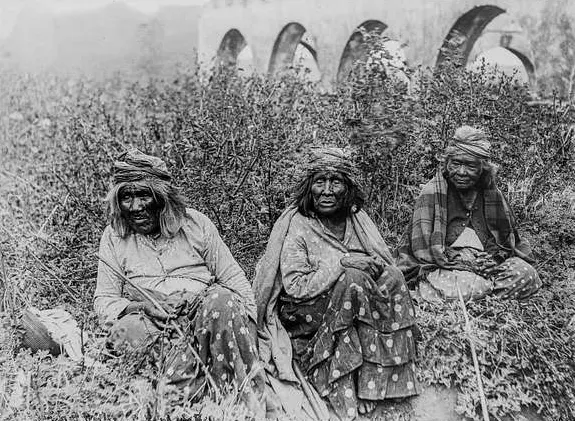 Group of Luiseños individuals seated in brush outside of Mission San Luis Rey de Francia